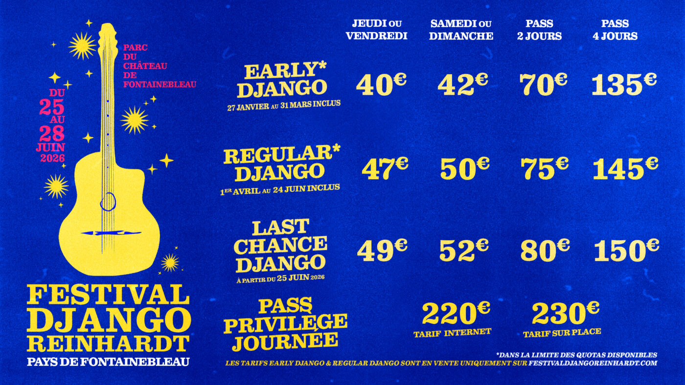 Le PASS 4 JOURS de la 46ème édition du Festival Django Reinhardt est disponible dès aujourd'hui ! La billetterie jour ouvrira très bientôt...
